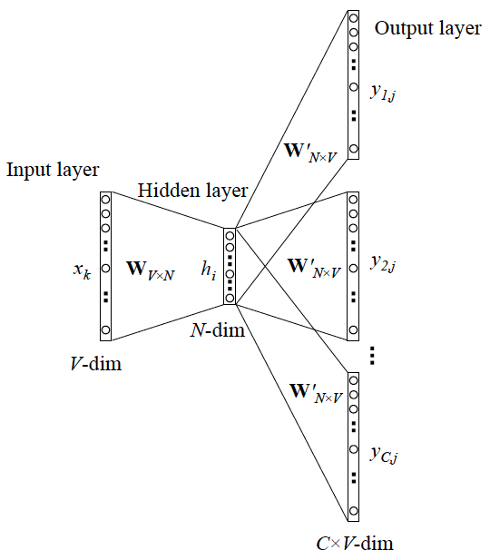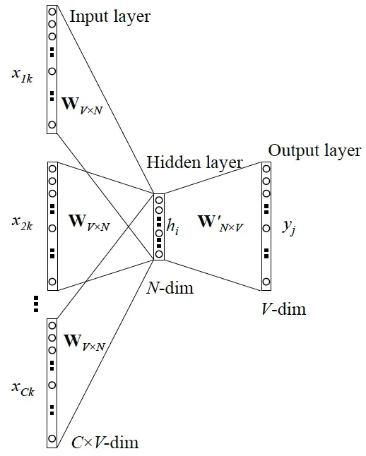 具体的流程是:输入单词Wt的前c个单词Wt-c,Wt-c+1,,,Wt-1和后c个单词Wt+1,Wt+2,,,Wt+c,预测单词Wt