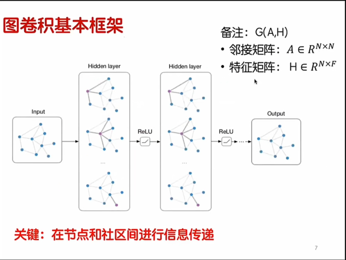 这个图卷积神经网络的第一层是输入的图,在第二层Hidden layer中,每一个结点都和特征矩阵进行计算,每一个计算出来的结果都会在节点处被更新,再经过一层Relu激活函数之后,进入新的隐藏层,重新进行计算。