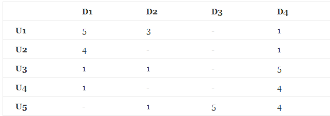 矩阵中,描述了5个用户(U1,U2,U3,U4 ,U5)对4个物品(D1,D2,D3,D4)的评分(1-5分),- 表示没有评分,我们的目的是把没有评分的给预测出来,然后按预测的分数高低,给用户进行物品推荐。